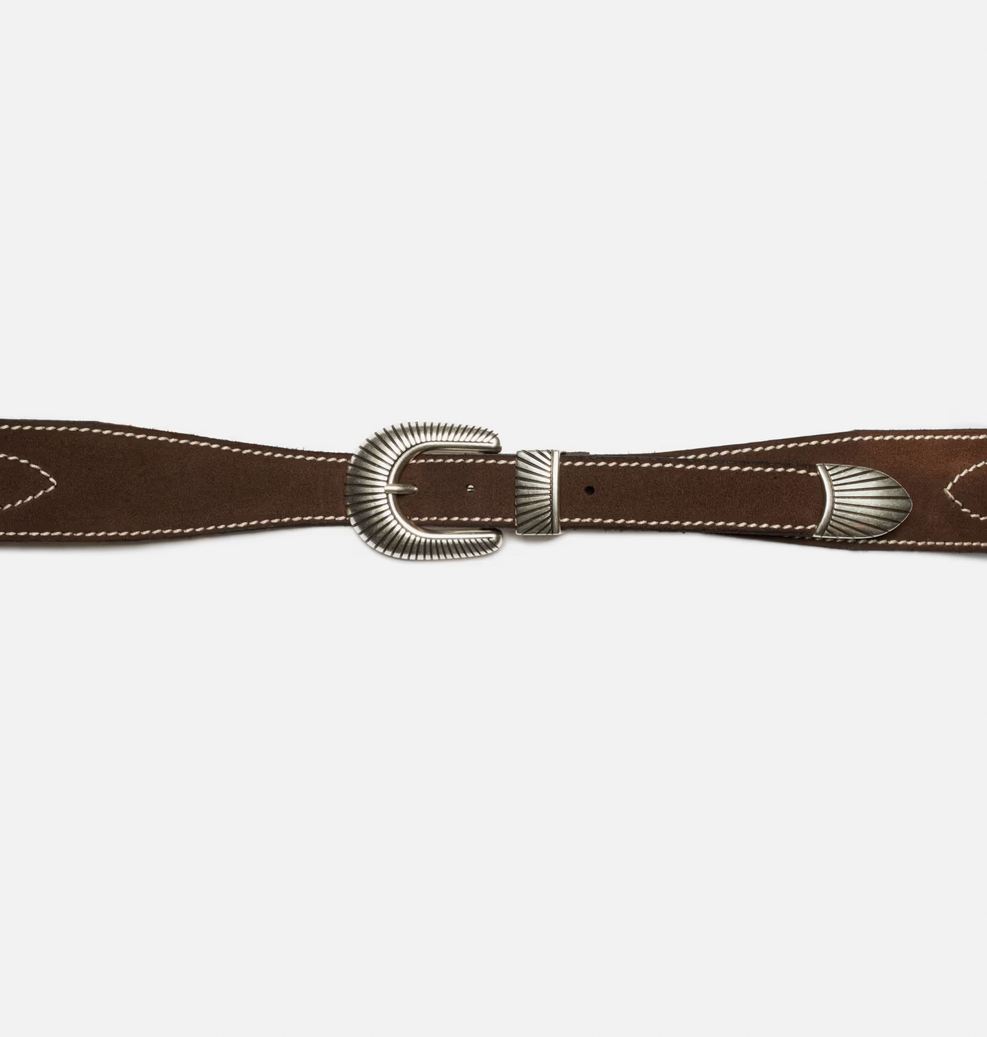 Western-style belt in suede lined with full-grain leather embroidered with contrasting thread. Antique silver loops, tip, and buckle.