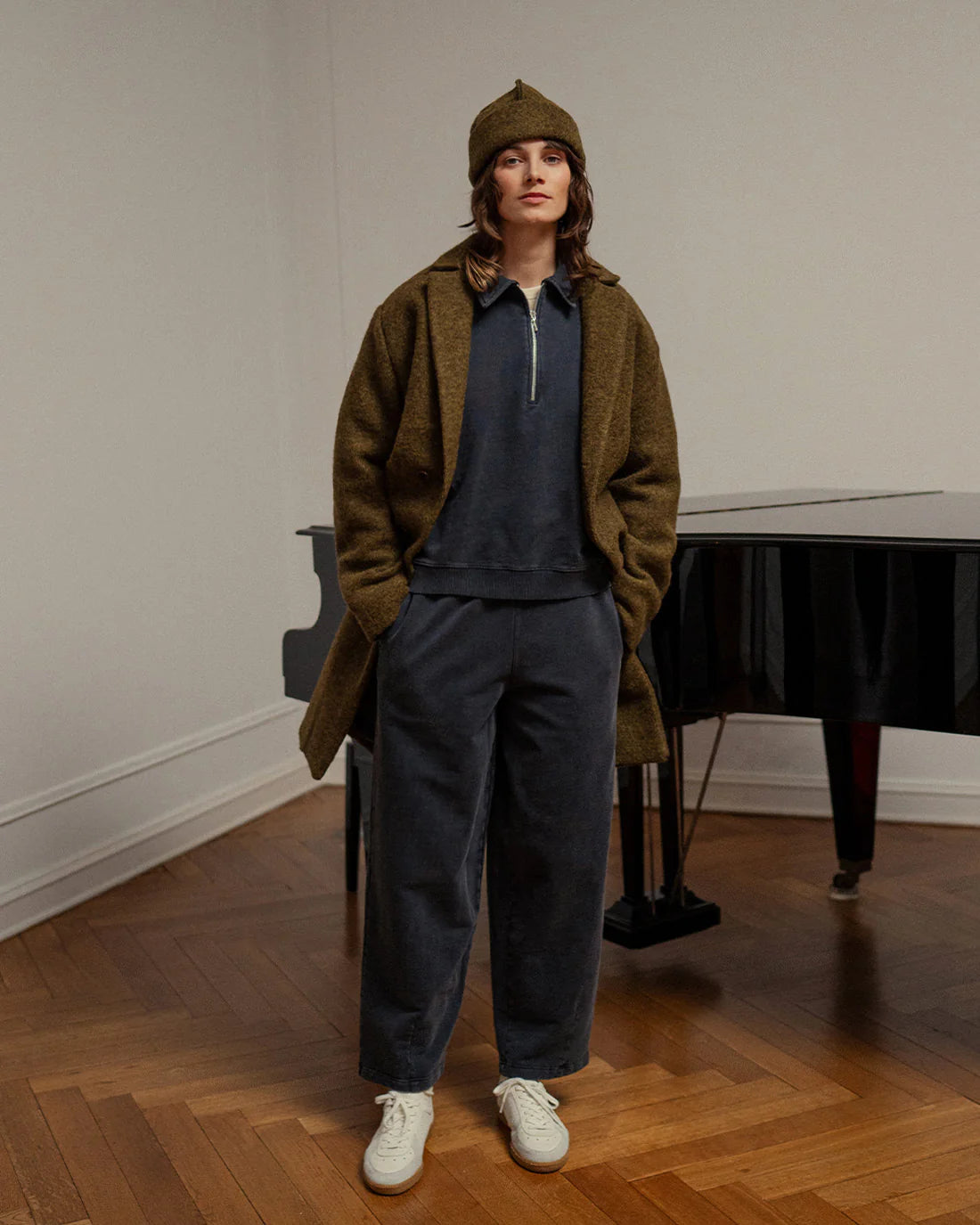 A minimalist winter coat in a generous oversized silhouette, crafted from a soft, finely brushed Italian fabric made of 75% mulesing-free organic wool and 25% organic cotton. The knee-length cut with two side welt pockets, an interior pocket, and refined buttons made from the nut of the Tagua palm combines clean lines with subtle elegance. Completed with a smooth lining of 100% organic cotton and carefully handcrafted in Portugal.