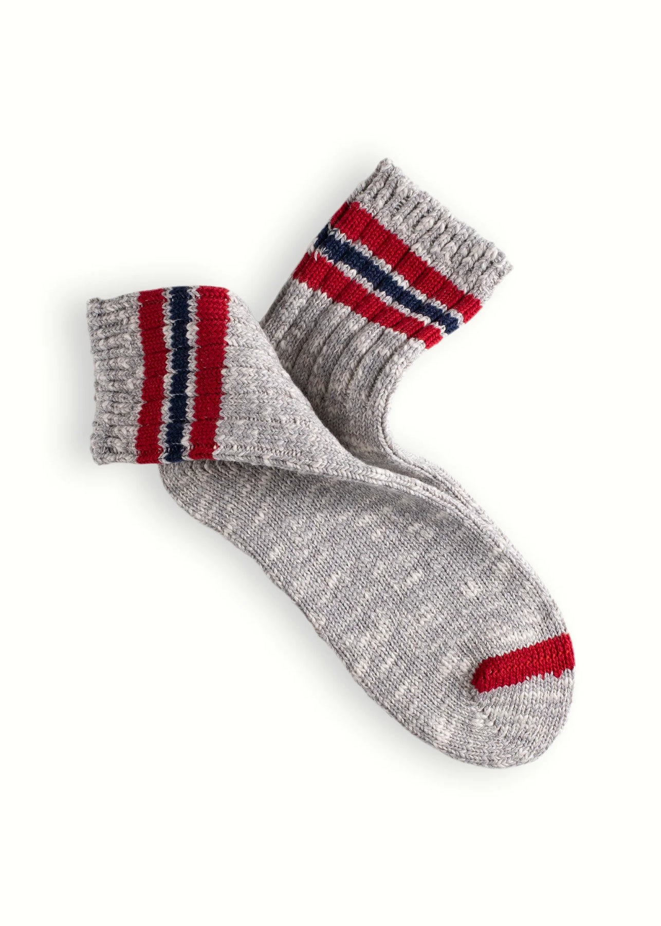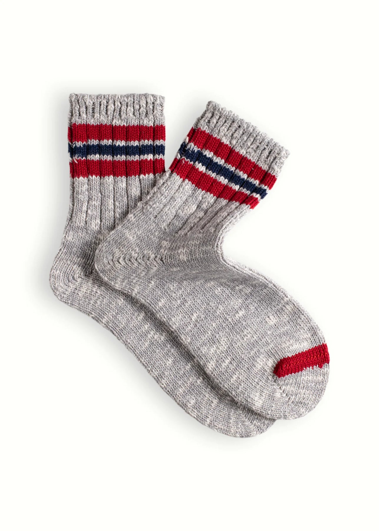 Our Athletic Grey & Navy Socks have a classic design with 3 upper stripes, in two colors , but we added some style on the design with the mix of yarns, one of slub white cotton and 2 more in different tones of Red.