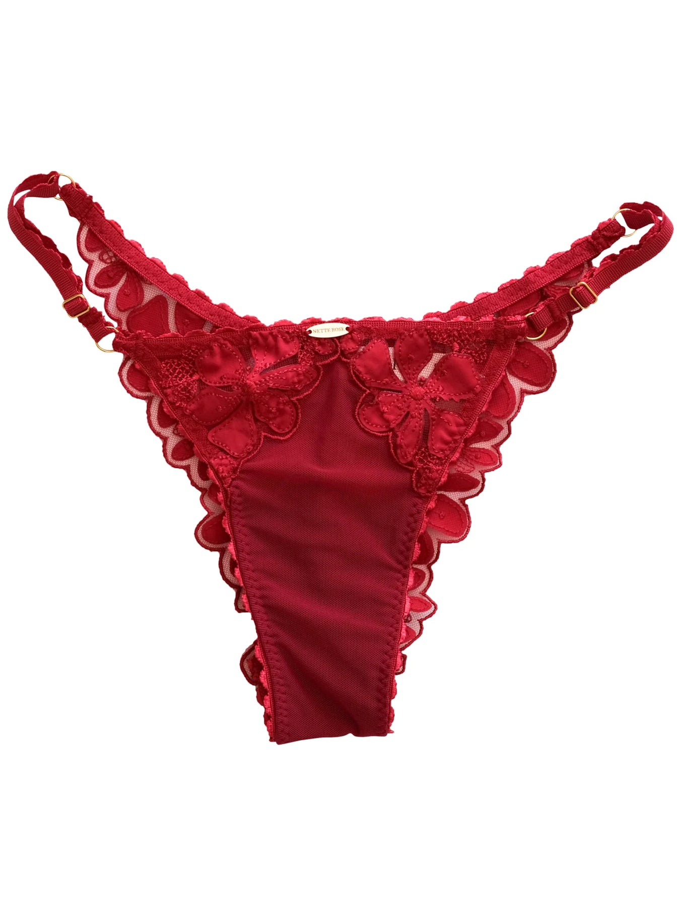 Floral red embroidery with adjustable side straps, for your own personalised fit.