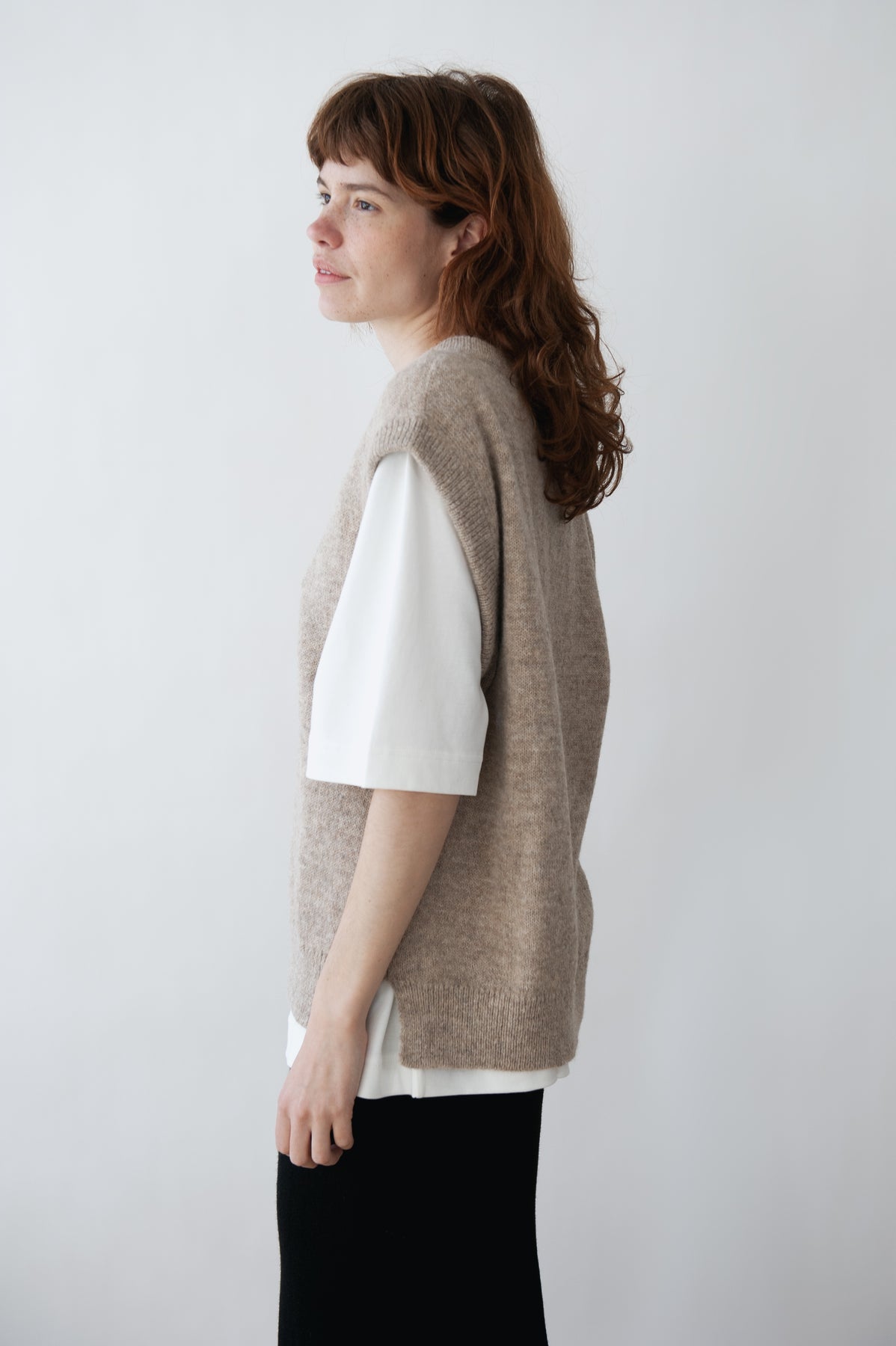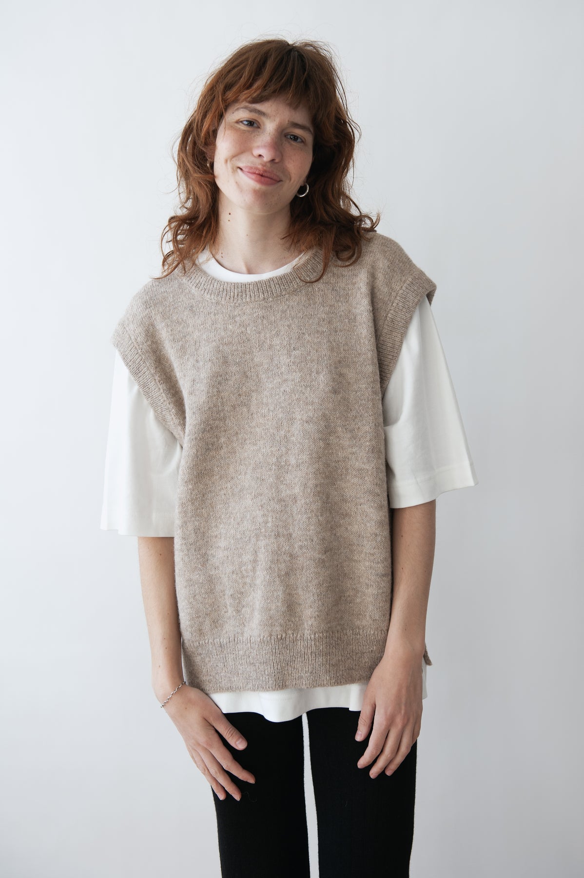 ROBIN WOOL VEST is the perfect trans-seasonal essential. Lightweight with a wide crewneck, dropped shoulders, and side slits, it can be worn alone or layered. One size fits all, ensuring a perfect fit for everyone.