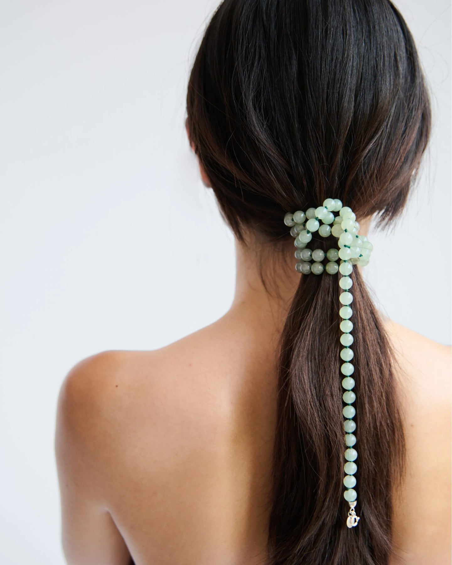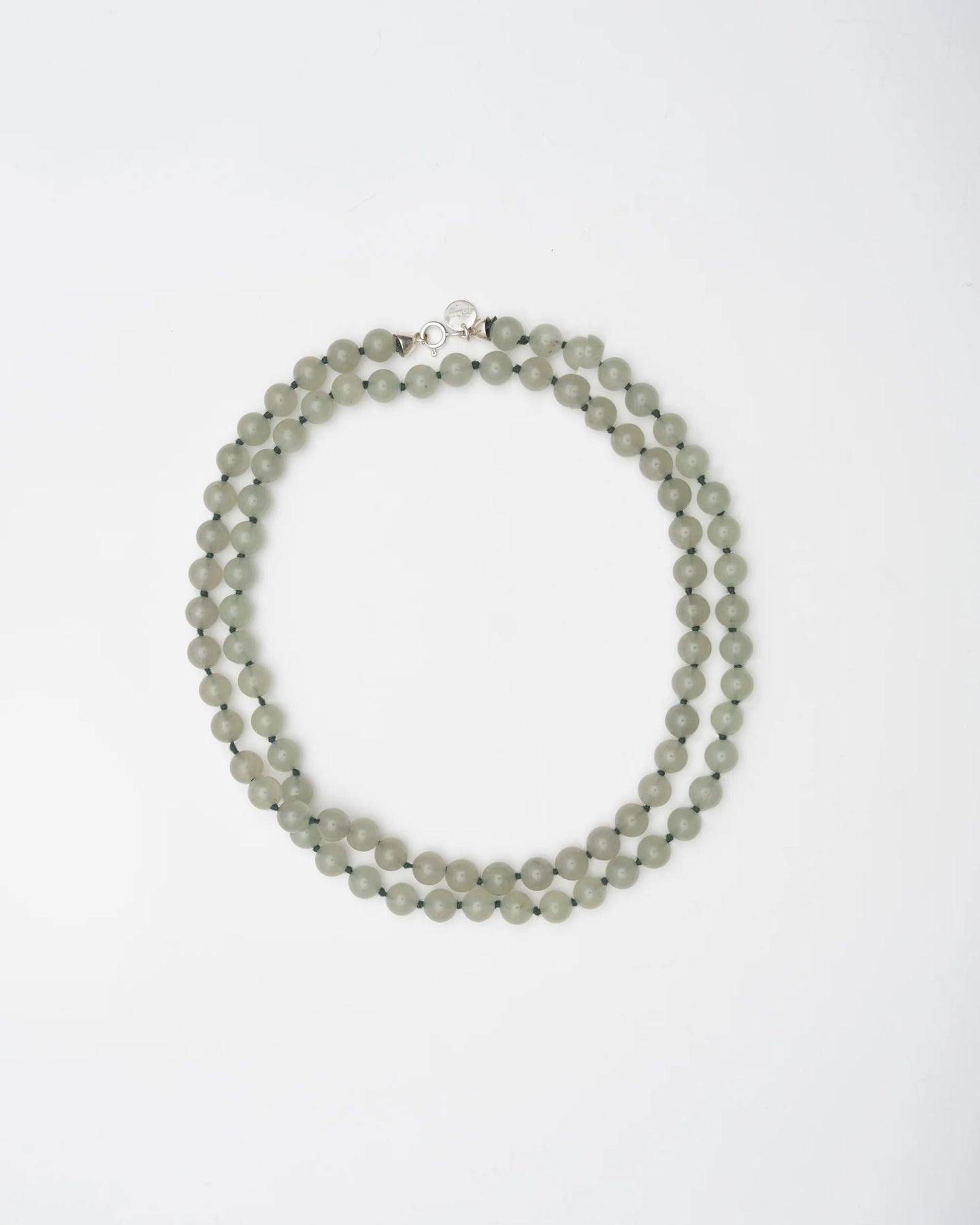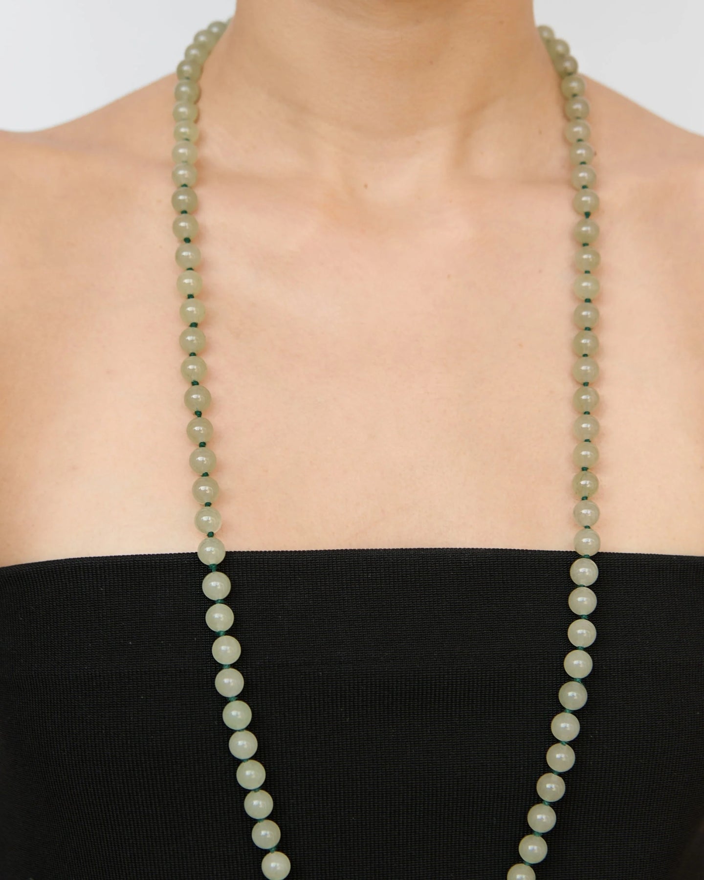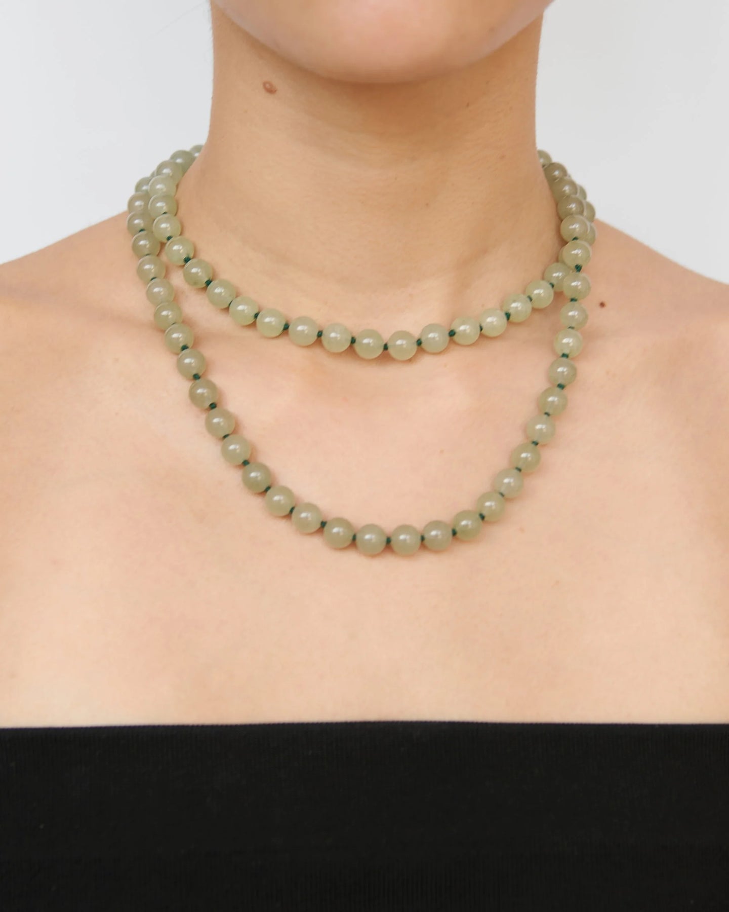 Seribu jade necklace silver hardware. The double length design allows you to choose between a long necklace or a double choker to fit your bold style. Crafted with knotted technique and jade beads, this statement piece is the perfect addition to your everyday-wear.