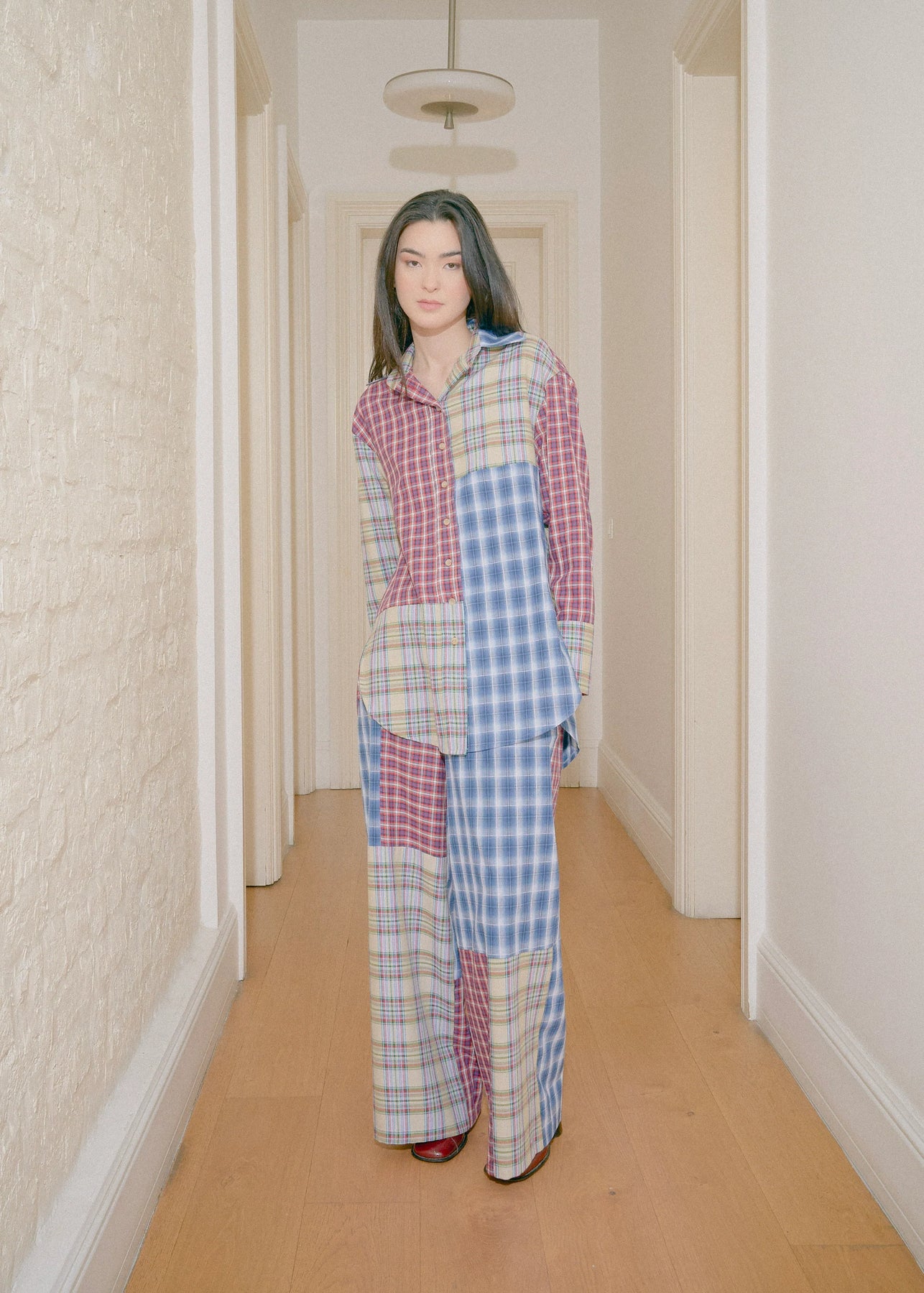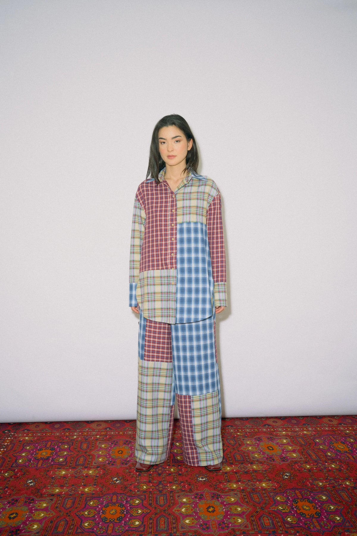 The Darcy Shirt redefines casual tailoring with its bold patchwork design, crafted from contrasting tartan panels for a modern twist on heritage patterns. Cut in an oversized silhouette, it offers ease and comfort while making a statement. Perfect styled loose over trousers for a relaxed look, or tucked in for a sharper edge.