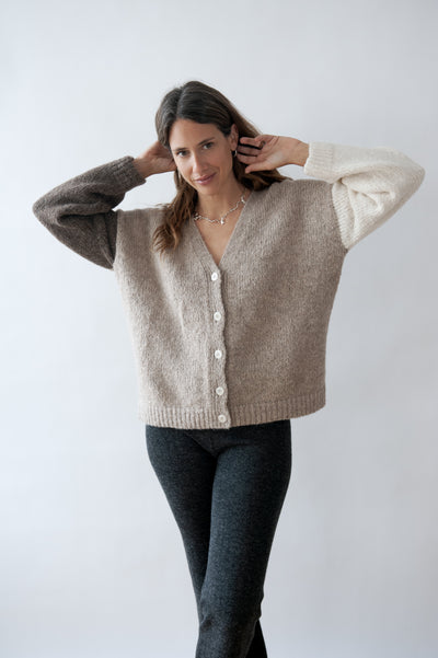 DELTA CARDIGAN is an absolute eye-catcher, showcasing a striking color-block design, and a flattering V-neckline. Crafted from the finest premium alpaca wool blended with a small percentage of recycled synthetics, it offers exceptional softness while maintaining its shape. Designed in an easy one-size fit, this cardigan drapes effortlessly over different body types, making it super versatile, perfect for layering over dresses, high-waisted trousers, or your favorite jeans.
