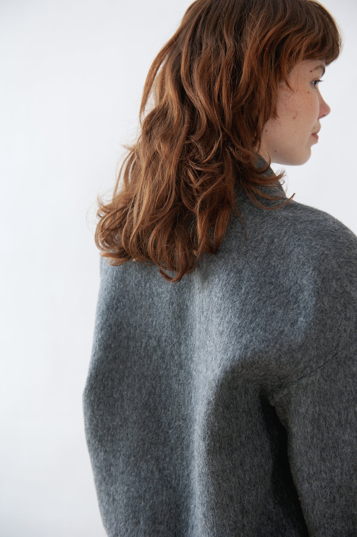 Designed with a two-sided, two-colored fabric, it comes with a small round collar, relaxed dropped shoulders, and side-seam pockets accessible from both sides.